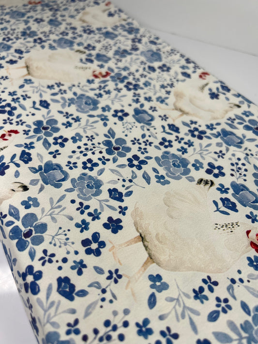 Floral Blue Chickens 100% Cotton, Cate & Rainn Farm & Meadows Country Chickens Cotton Fabric