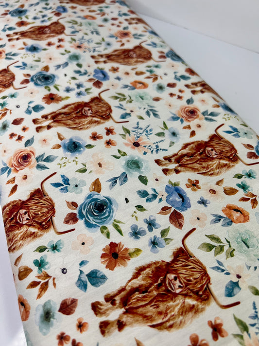 Blossom Highland Cow 100% Cotton, Cate & Rainn Blossom Highland Cow Cotton Fabric, Quilting Cotton